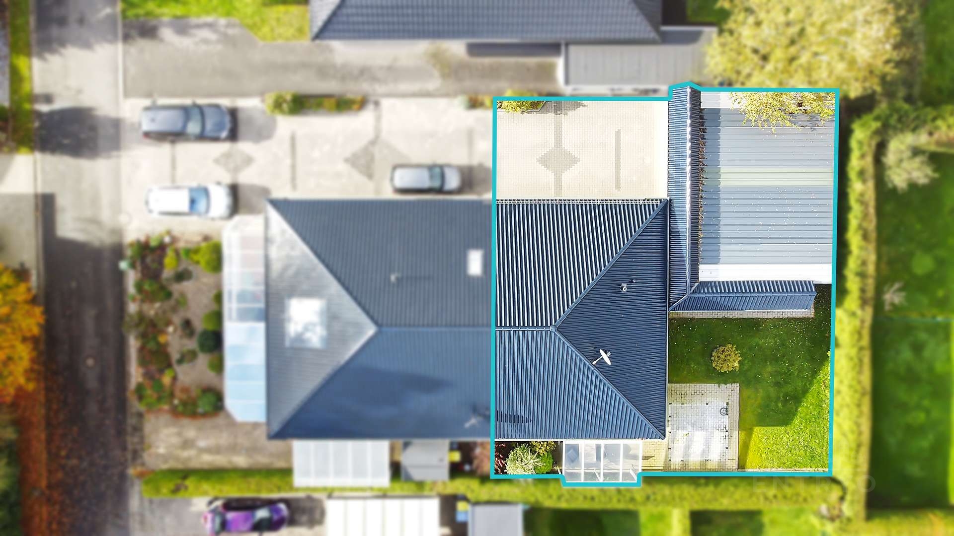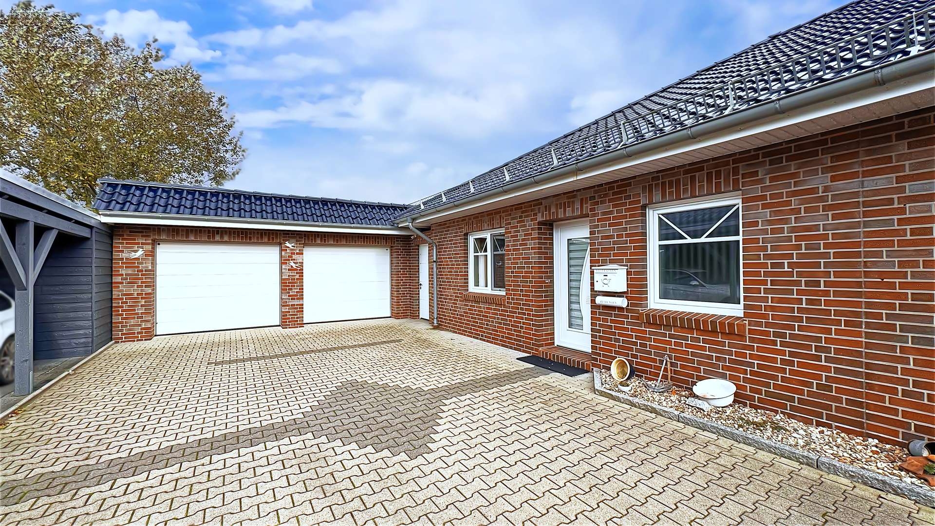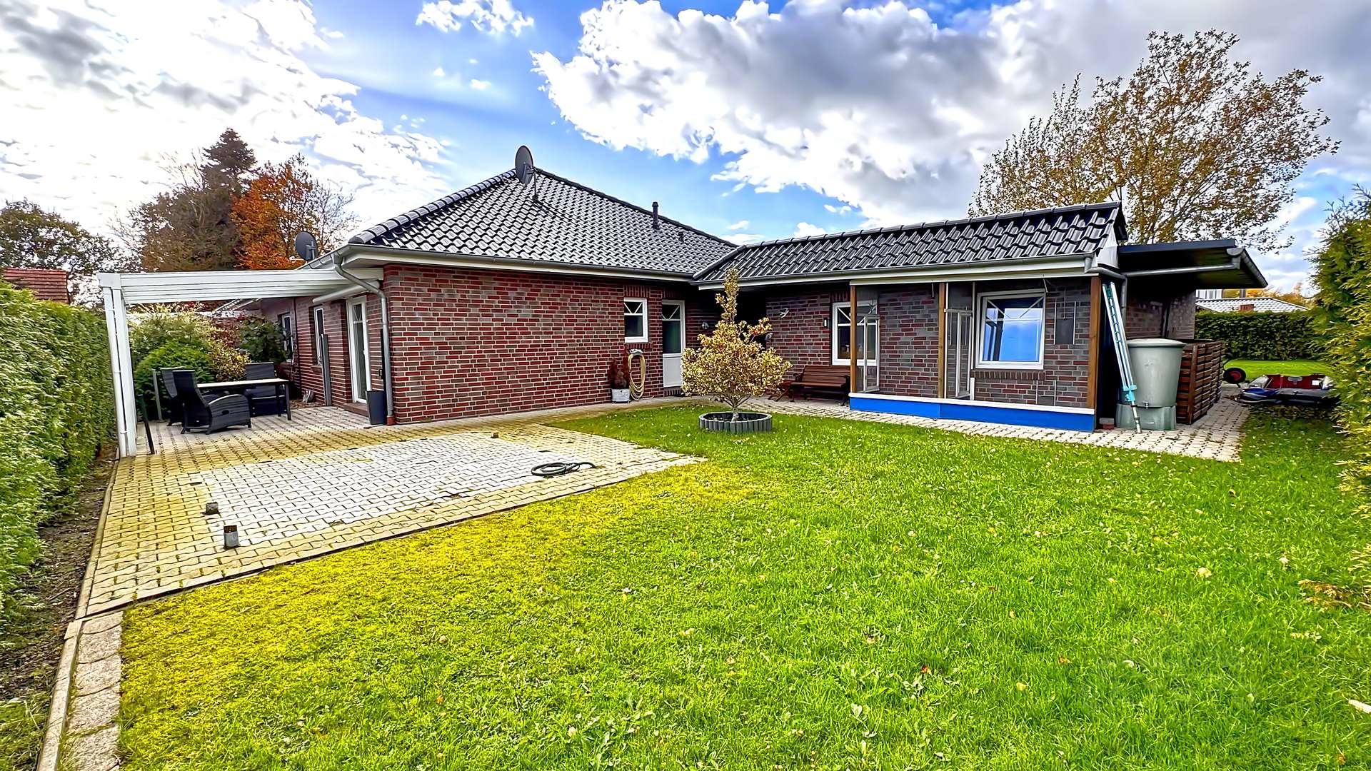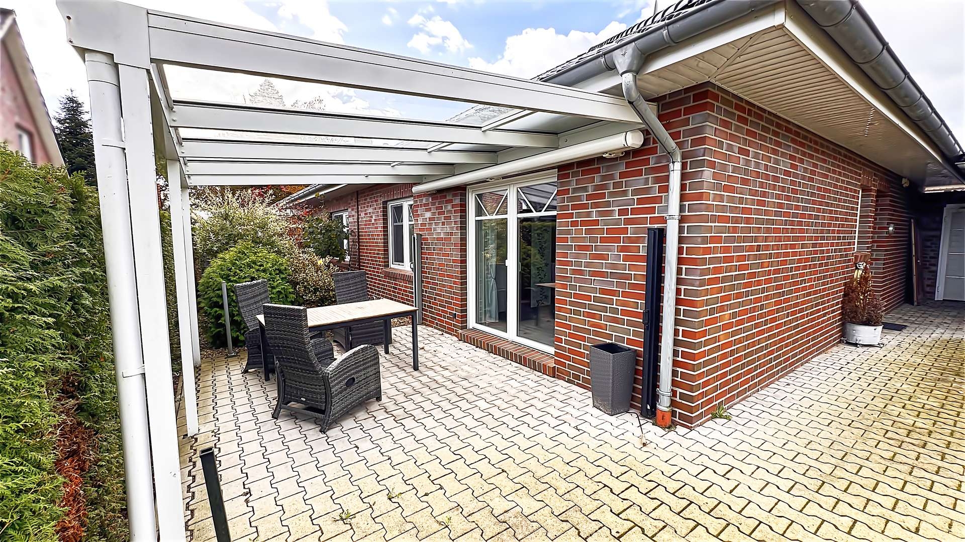 Ein weiteres Highlight ist die überdachte Terrasse aus Aluminium mit einer zusätzlichen Markise, die an sonnigen Tagen angenehmen Schatten spendet. Der Nebeneingang ermöglicht einen praktischen Zugang zum Garten oder Hauswirtschaftsraum. Der pflegeleichte Garten lädt zum Verweilen und Entspannen ein.