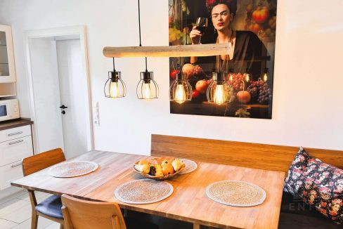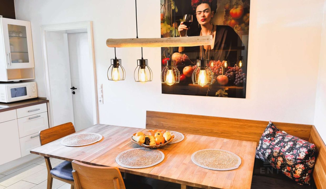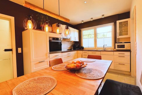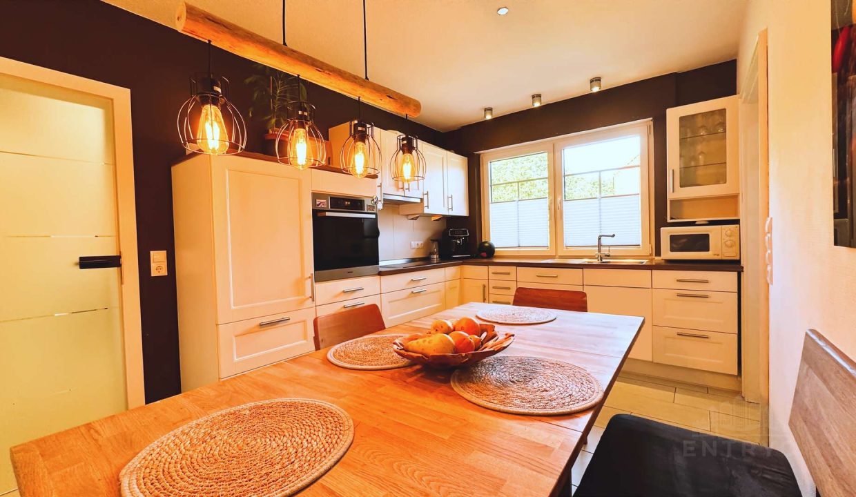 Die im Jahr 2012 maßgefertigte Einbauküche im charmanten Landhausstil vereint zeitlose Gemütlichkeit mit moderner Funktionalität. Sie bietet nicht nur hochwertige Einbauten und durchdachte Stauraumlösungen, sondern auch ausreichend Platz für einen Esstisch, an dem sich das Familienleben ganz selbstverständlich entfalten darf – ideal für gemeinsame Mahlzeiten, Gespräche und entspannte Abende.