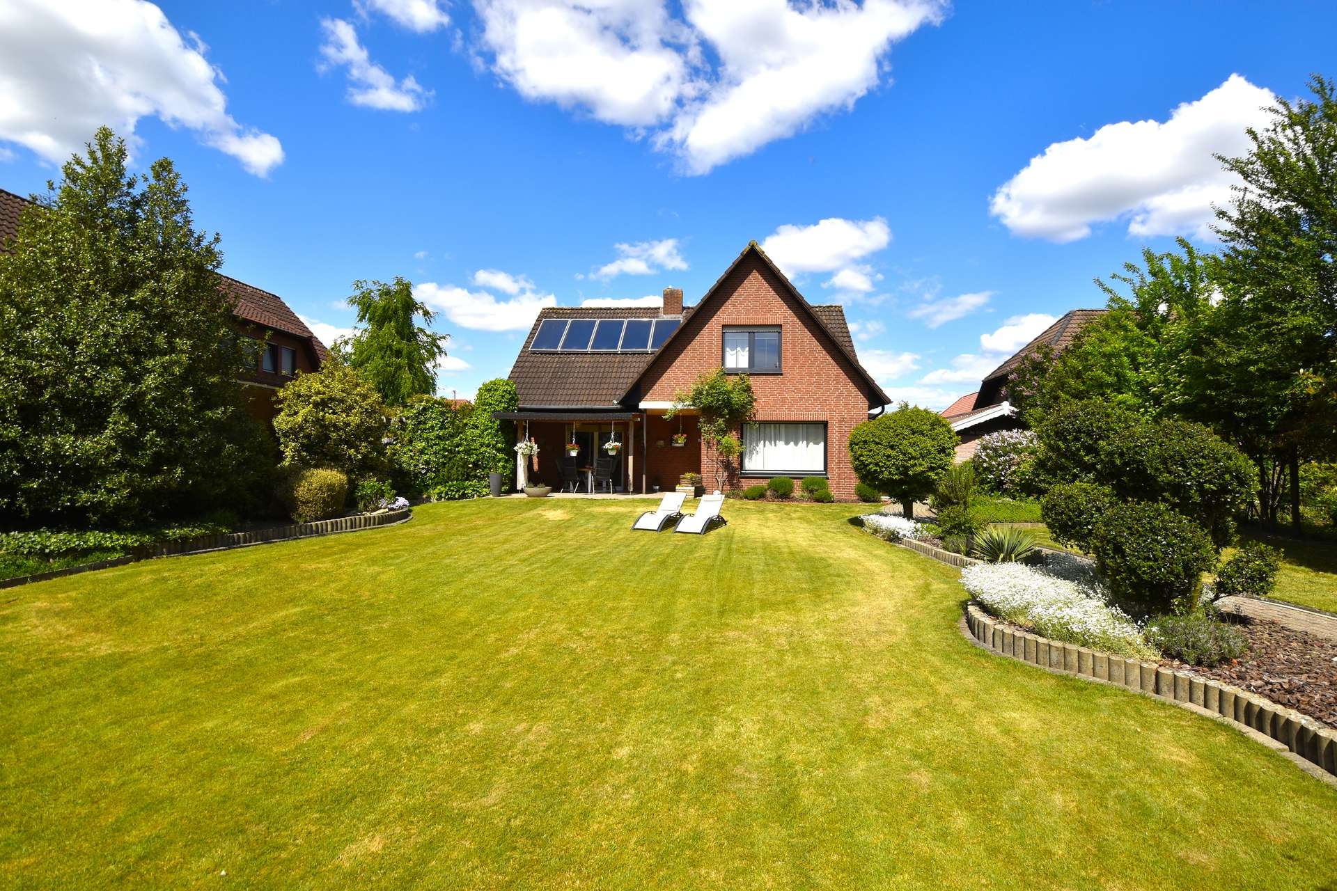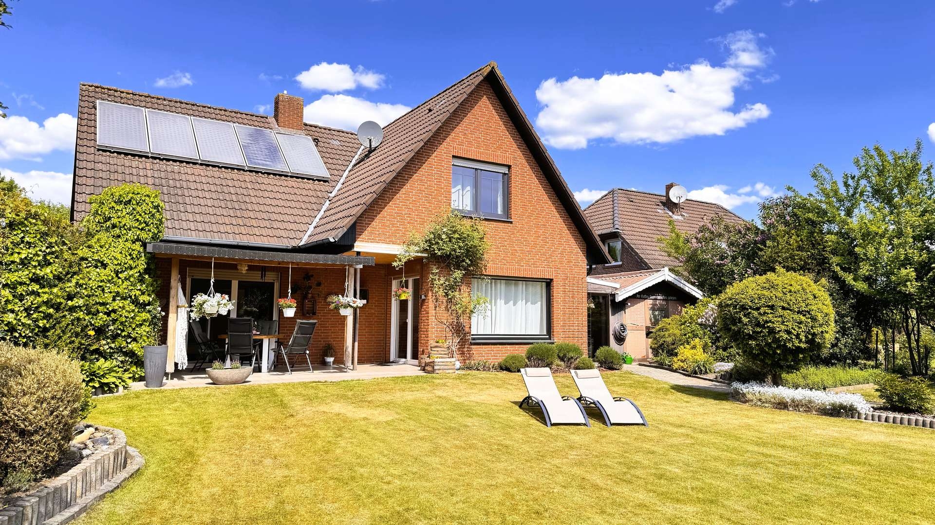 Das im Jahr 1985 in massiver Klinkerbauweise errichtete Haus überzeugt mit seiner hellen, einladenden Atmosphäre und vielen liebevoll gepflegten Details. Herzstück ist das lichtdurchflutete Wohnzimmer mit ca. 33 m², das mit direktem Zugang zur überdachten Terrasse und wunderschönem Blick in den Garten begeistert. Gleich daneben: ein großes Schlafzimmer – ebenfalls mit Zugang und Blick zum Garten und der überdachten Terrasse.