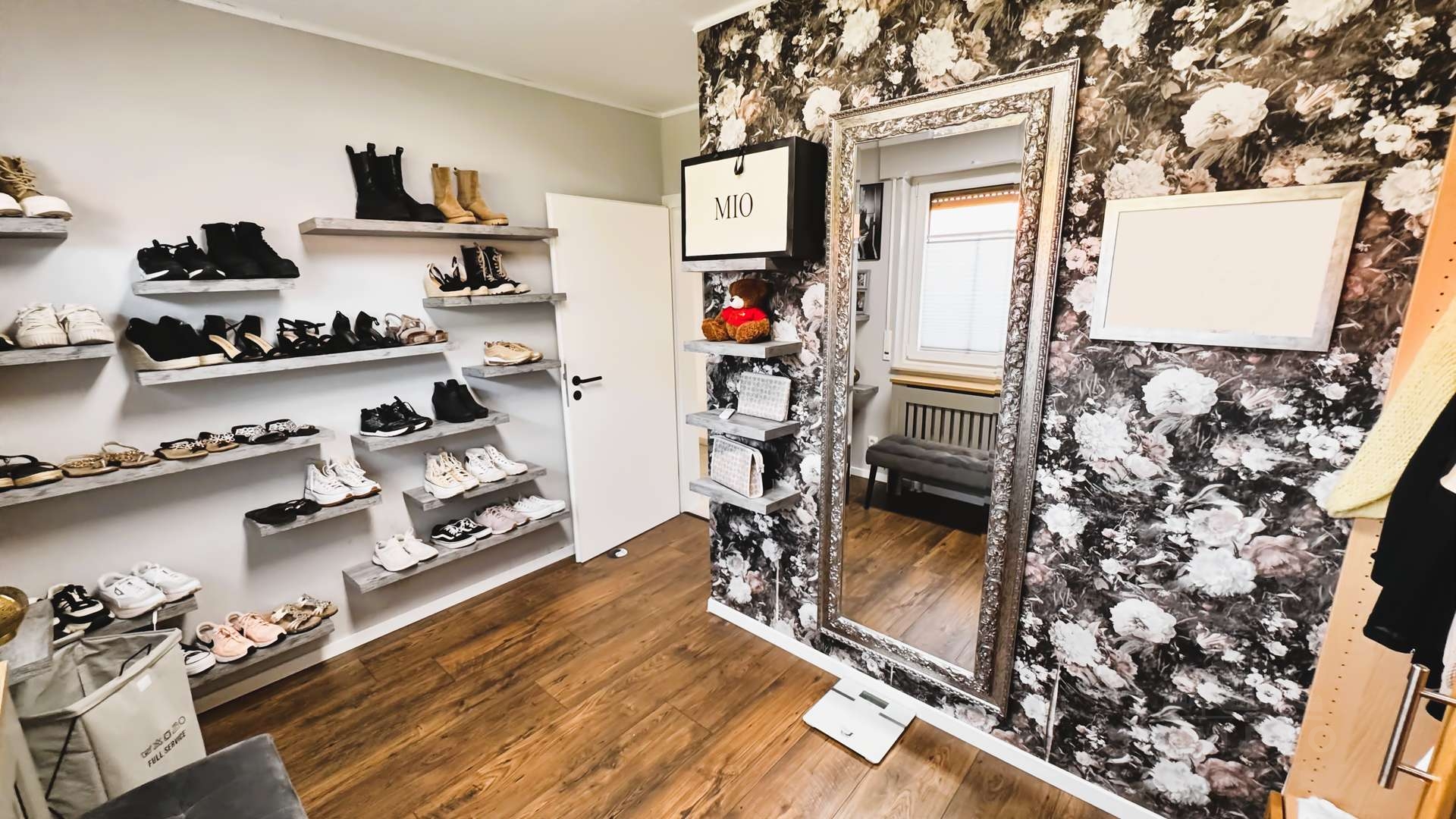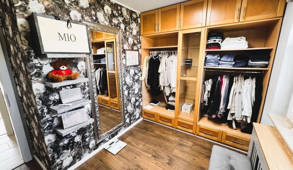 Ein weiteres Zimmer, derzeit als Ankleide genutzt, ergänzt das Raumangebot im Erdgeschoss, ebenso wie ein modernisiertes Badezimmer mit Dusche und Whirlpool-Badewanne, ein separates Gäste-WC mit Urinal, eine praktische Garderobe sowie eine helle, großzügige Diele mit offener Treppe in das Obergeschoss und den Keller.