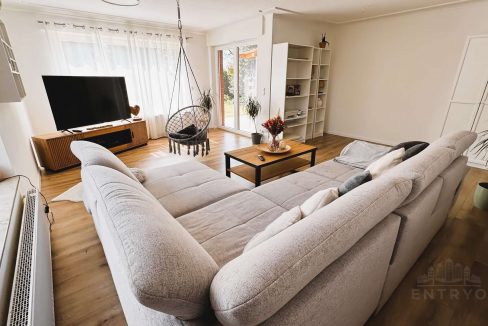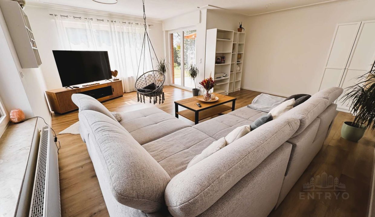 – Großes, lichtdurchflutetes Wohnzimmer (ca. 33 m²) mit Zugang zur Terrasse und Gartenblick