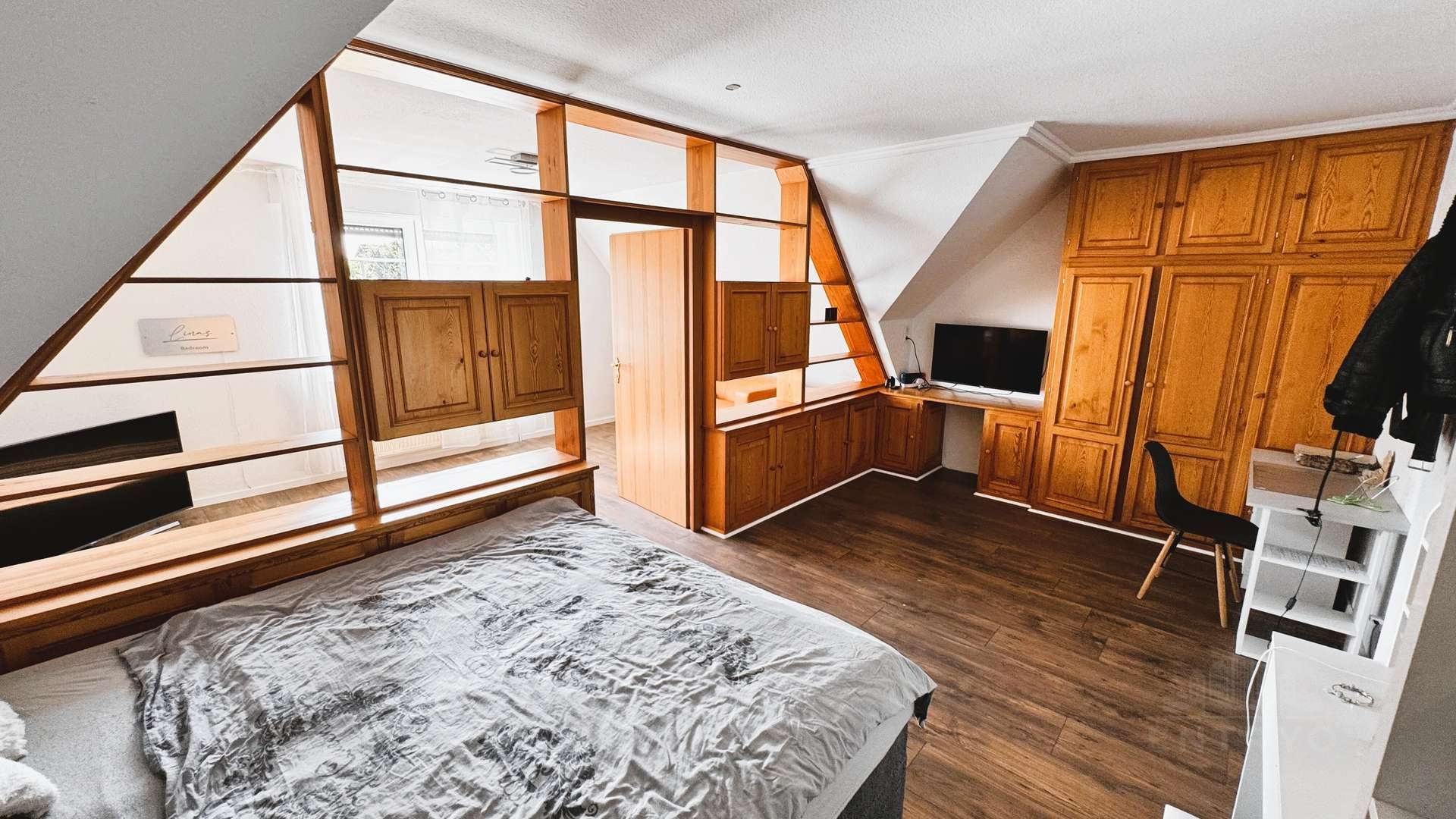 Im Dachgeschoss stehen vier Schlafzimmer zur Verfügung – darunter ein eindrucksvolles Zimmer mit ca. 38 m², stilvoll unterteilt mit maßgefertigten Echtholz-Einbauschränken. Ein zweites Badezimmer mit Dusche sowie ein zentraler Flur bieten auch im Obergeschoss besten Wohnkomfort. Die Decke zum darüberliegenden Spitzboden ist gedämmt.
