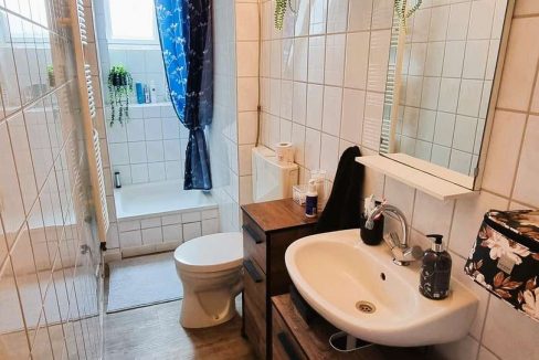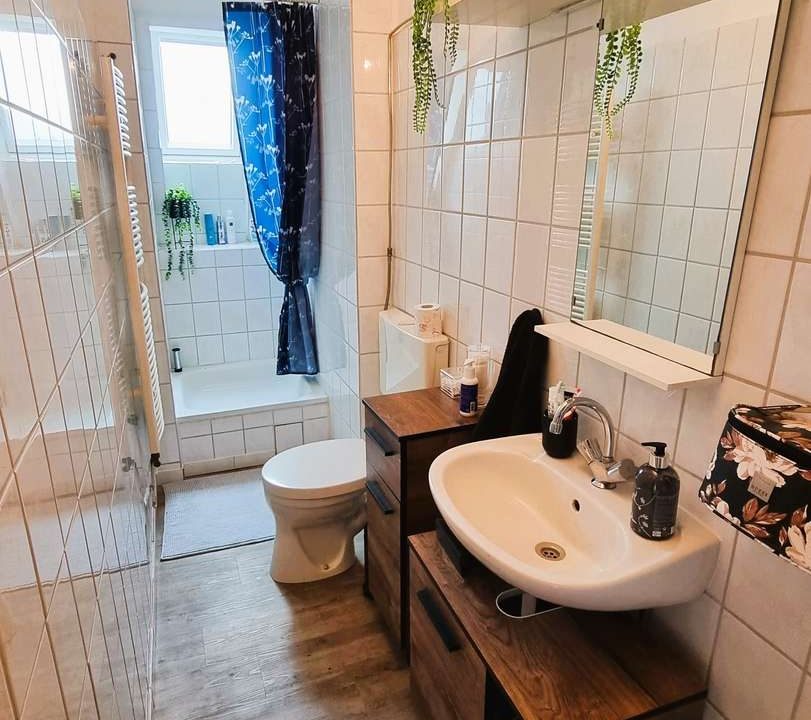 Das Badezimmer ist geschmackvoll mit Fliesen ausgestattet und bietet alle notwendigen Annehmlichkeiten für Ihren täglichen Bedarf. Der Bodenbelag aus Laminat verleiht den Wohnräumen eine warme und einladende Atmosphäre.