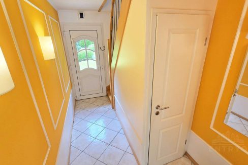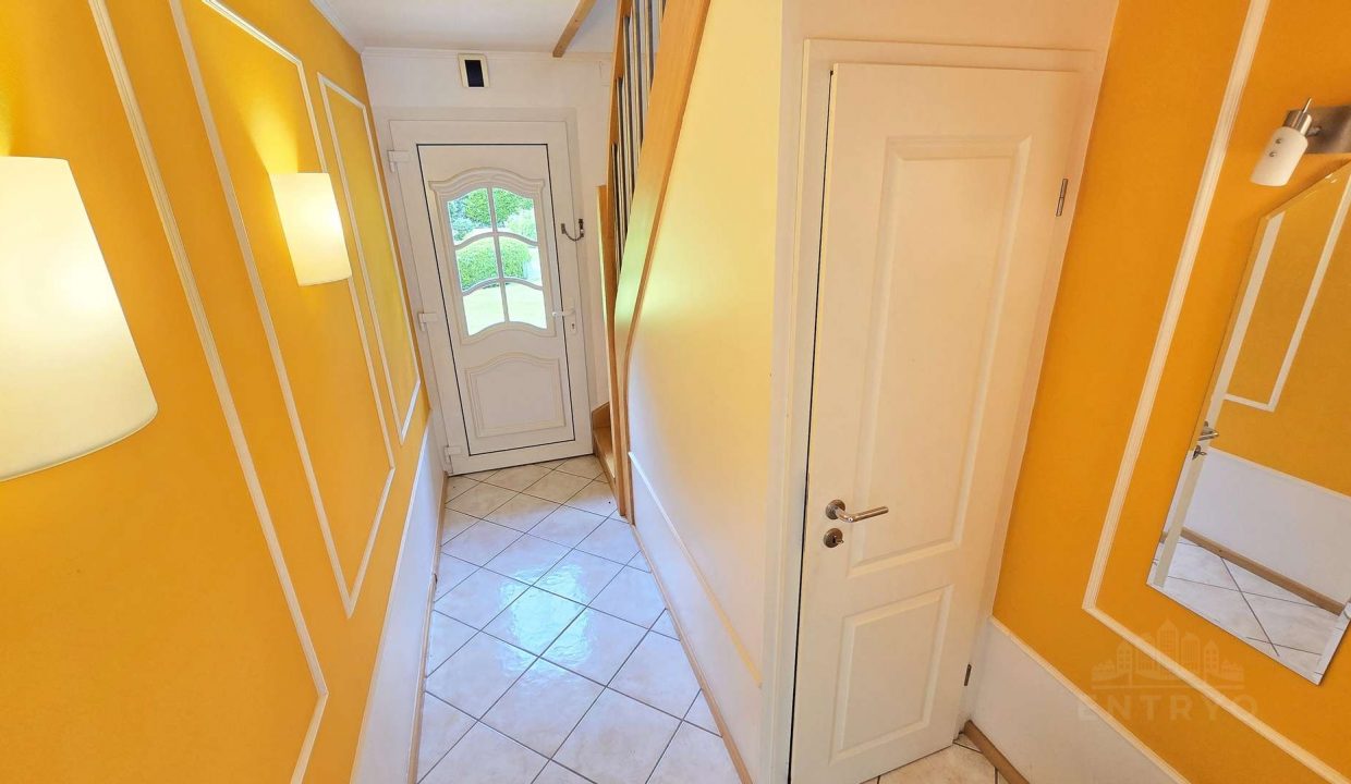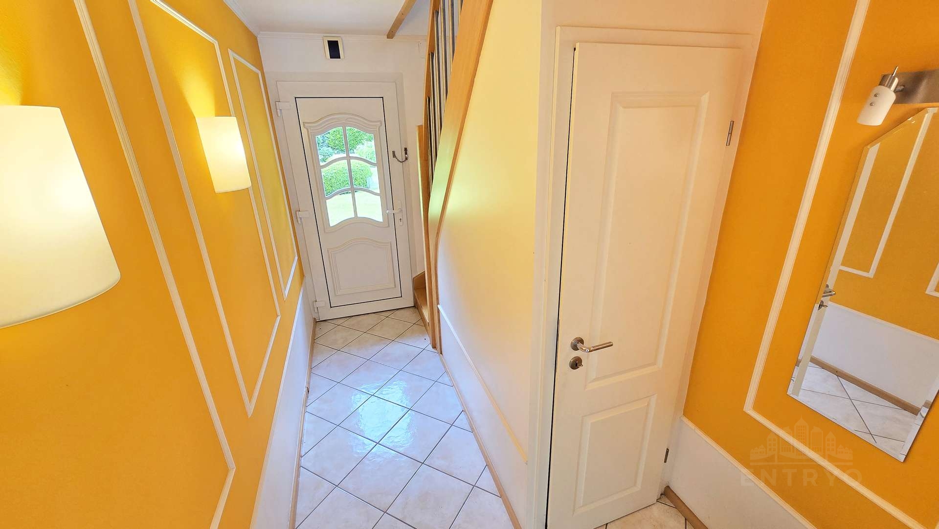 Im Innenbereich dominieren helle, freundliche Materialien: Landhaustüren mit weißen Holzzargen verleihen dem Haus eine klassische Note, während die hellen Fliesenböden im gesamten Erdgeschoss – diagonal verlegt – für ein offenes Raumgefühl sorgen. Eine massive Buchenholztreppe mit Edelstahlhandlauf führt ins Obergeschoss.